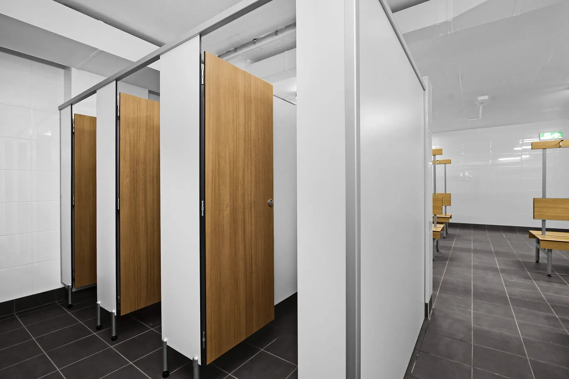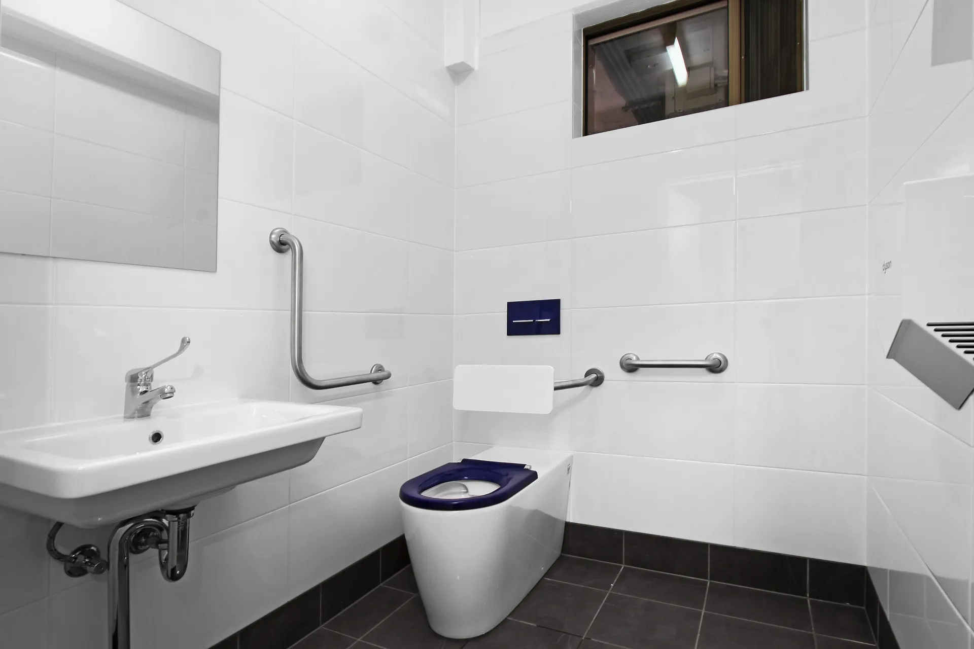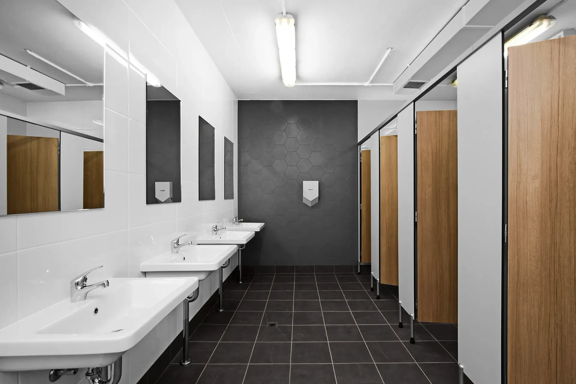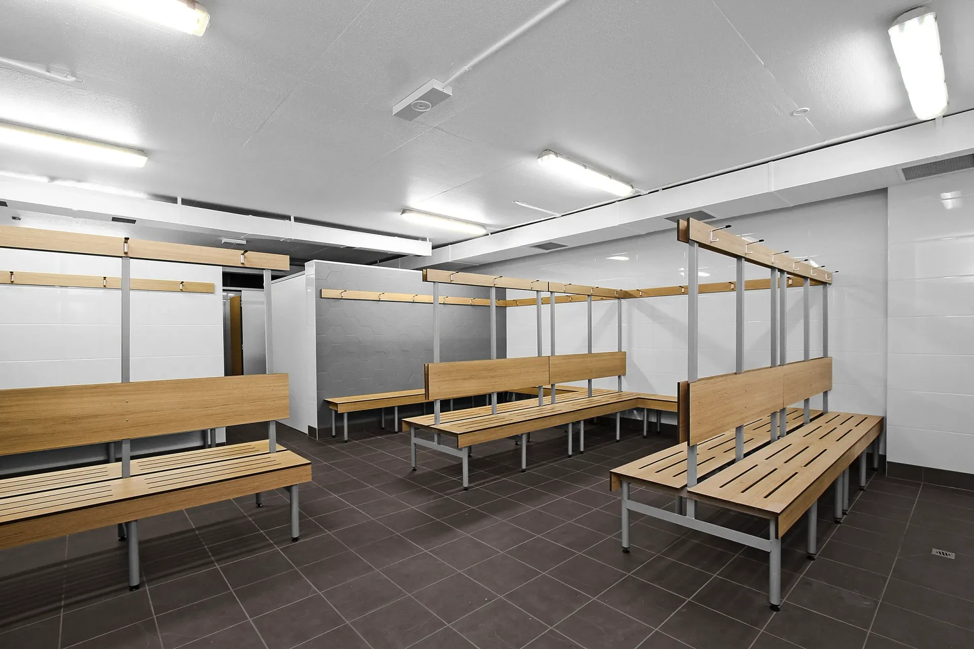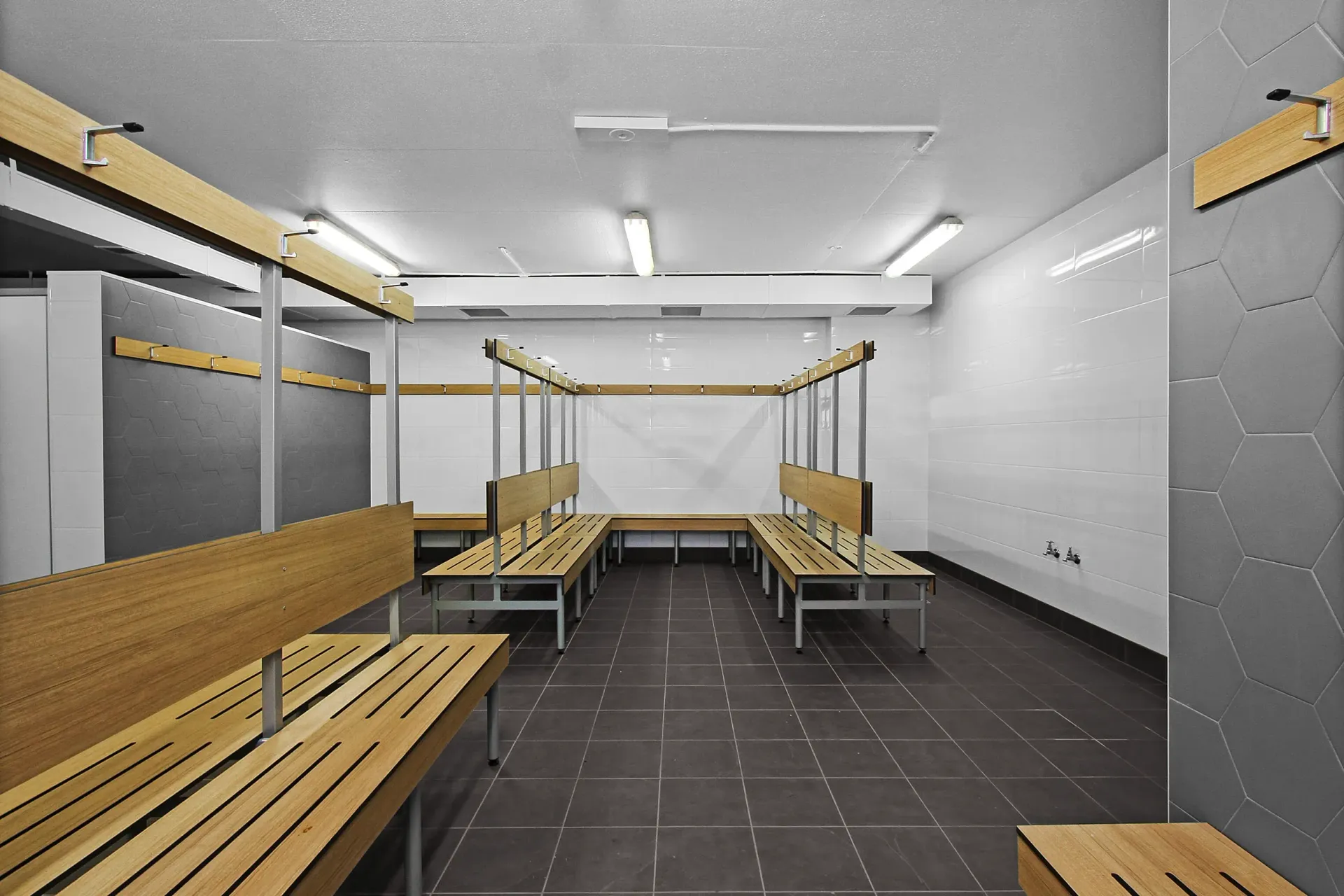 Demolition, Carpentry, Plumbing Upgrade, Electrical Upgrade, Floor Preparation & Waterproofing, Floor & Wall Tiling, Feature Tiles, Glazing, Compact Laminate Partitioning, Bench Seating & Coat Hooks, Sanitaryware Installation, Painting, Signage, Access Bathroom Refurbishment, Full Site Clean.